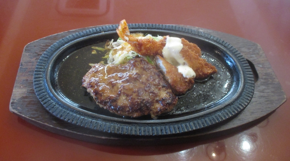 ハンバーグにエビと白身魚のフライが熱々の状態で出てきました。サイズ的には小さめですが、この値段で文句を言うと罰が当たるというもんです。