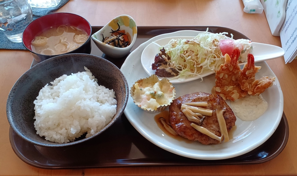 15分ほどでハンバーグとエビフライの定食の登場です。おかずたっぷりのプレートの他にひじきの煮物、味噌汁、ご飯付きです。とってもいいんざないすか!